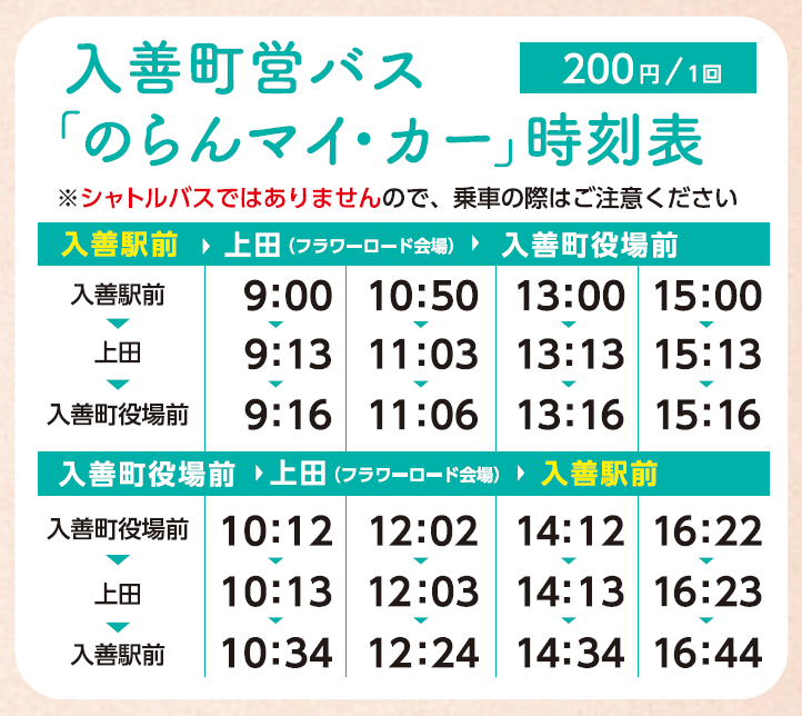 徒歩(1分)→富山地鉄バス「新幹線市街地線」→あいの風とやま鉄道「黒部駅」→同「入善駅」→町営バス(約15分)→にゅうぜんフラワーロード会場